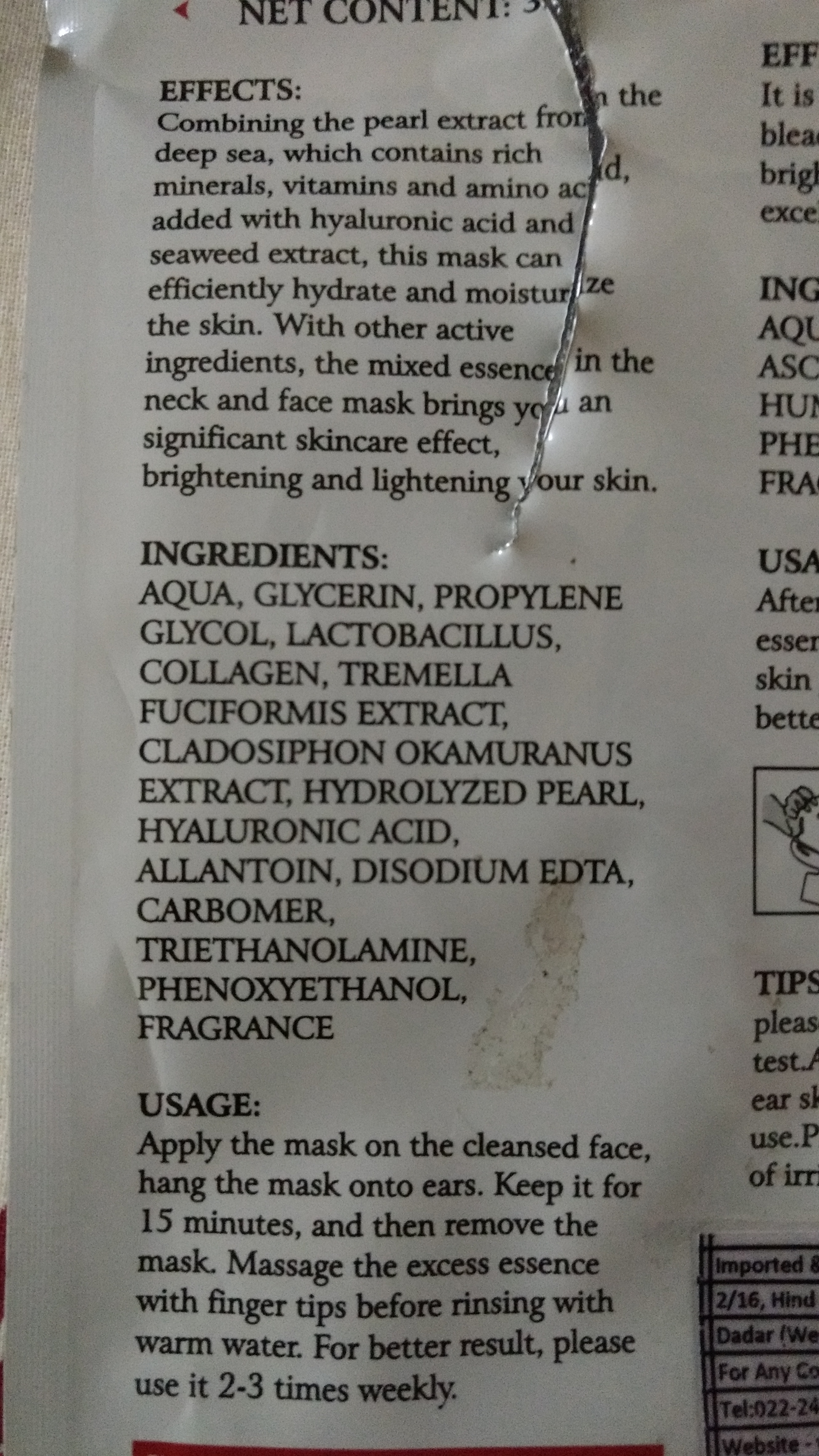 Claim : Combining the pearl extract from the deep sea , which contains rich minerals, vitamins and amino acid added with hyaluronic acid and sea weed extract , this mask can efficiently hydrate and moisturize the skin . With other active ingredients , the mixed essence in the neck and face mask brings you an significant skincare effect , brightening and lightening your skin.