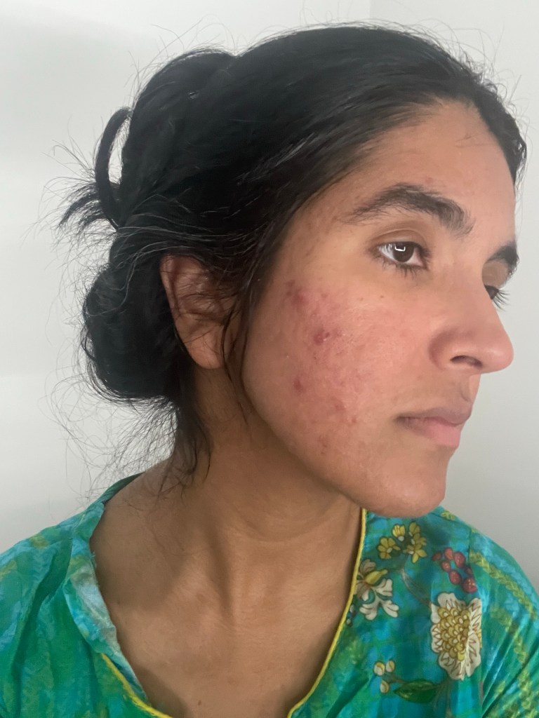 1) Inflammation: The angry red bumps and deep pustules from my starting pictures have flattened a lot. The current breakouts are much calmer, with fewer active lesions
